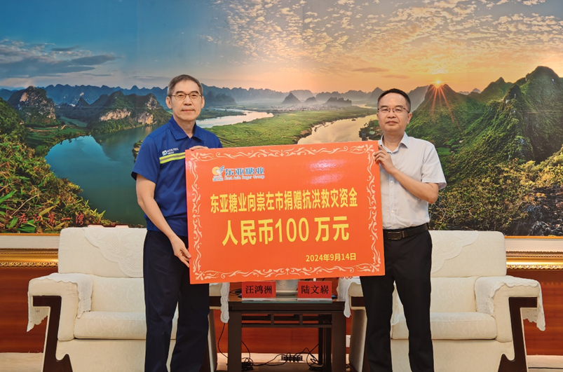 為支援崇左市抗洪救災(zāi)工作,東亞糖業(yè)向崇左市捐贈(zèng)100萬(wàn)元善款助力摩羯臺(tái)風(fēng)災(zāi)后重建恢復(fù)。2024年9月14日上午在崇左市市會(huì)議中心舉行了捐贈(zèng)活動(dòng),崇左市委常委、統(tǒng)戰(zhàn)部長(zhǎng)陸文嶄、東亞糖業(yè)首席執(zhí)行官汪鴻洲等相關(guān)領(lǐng)導(dǎo)參加了捐贈(zèng)活動(dòng)儀式。